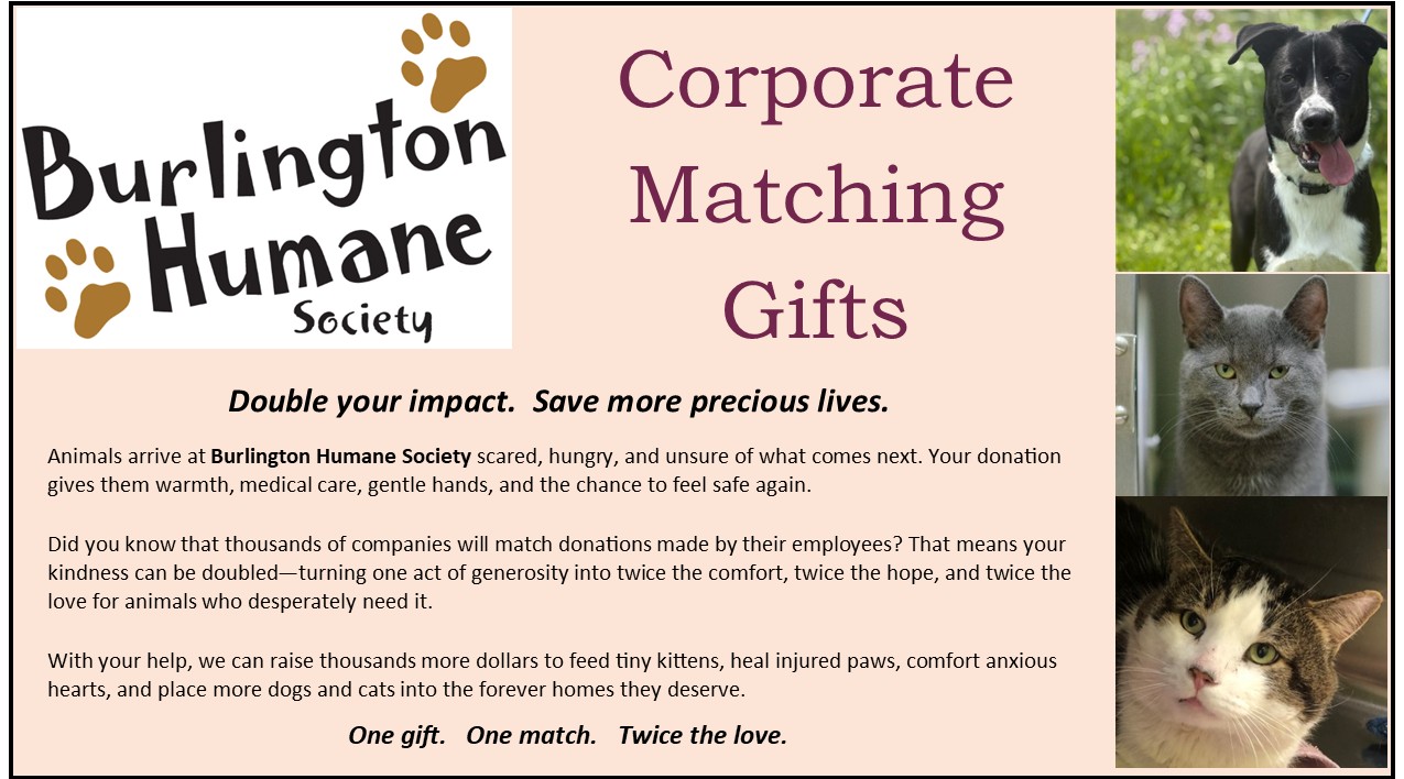Double your impact to save more animals. Thousands of companies match donations by employee to Burlington Humane.